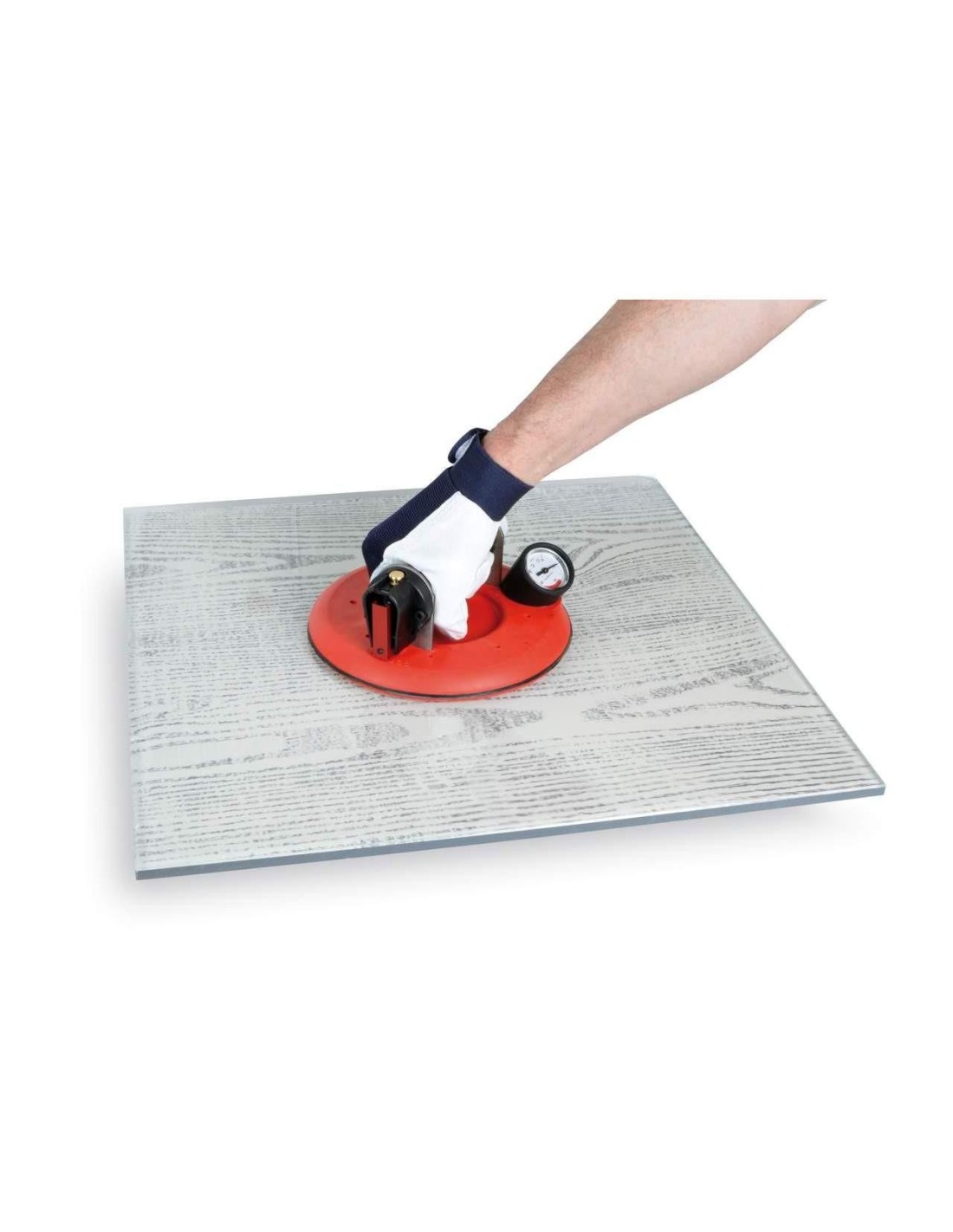 Large suction cup (Ø 20cm – 8”), equipped with a “vacuum” safety gauge that will show instantaneously any loss of adhesion with the tile.