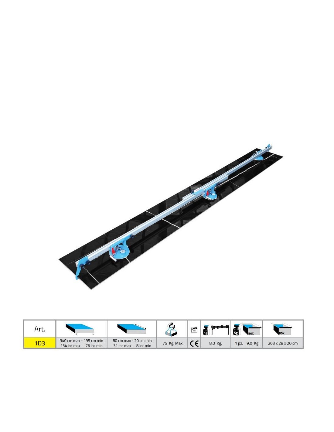 ""KERA-LIFT"" equipment with suction cups for lifting, moving and laying large tiles, freely adaptable to the shape of the tile without the use of tools, is composed of guides that slide together to adapt to any shape of the slab, equipped with the brand new patented SIGMA suction cups with rapid activation system, Pro-Grip, with vacuum gauge and stain-resistant rubber.